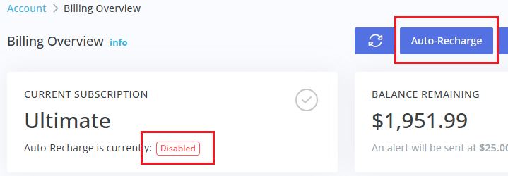 Customers on the Ultimate package can enable the Auto-Recharge feature on their account, by selecting the “Auto-Recharge” button: