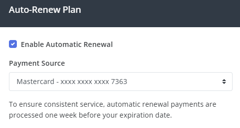 Click the “Auto-Renewal” option under your current month-to-month package, and then click to enable the auto-renew feature, and select a payment source: