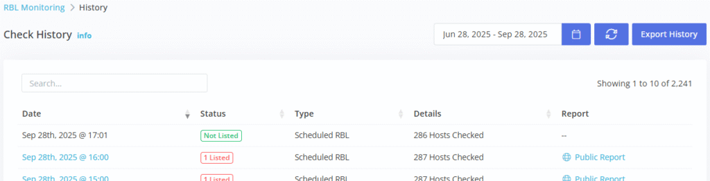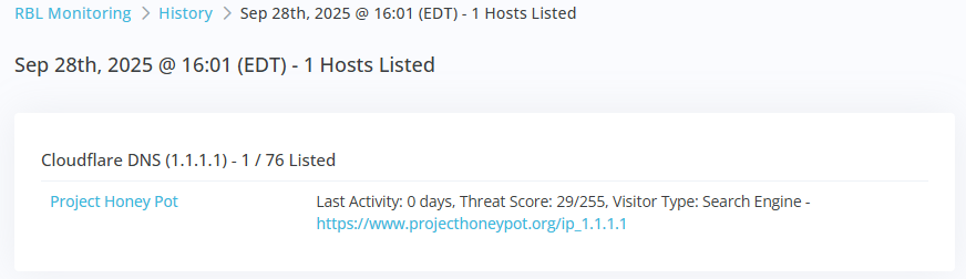 The results overlay will list all the hosts processed in this check, and all RBL details for any listed hosts.